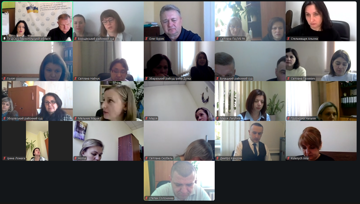 21 жовтня 2025 року у Територіальному управлінні ДСА України у Тернопільській області (в режимі відеоконференцзв’язку), під керівництвом начальника ТУ ДСА України у Тернопільській області – Федора Шевчука відбулась робоча нарада з керівниками апаратів місцевих загальних судів Тернопільської області та їх заступниками.