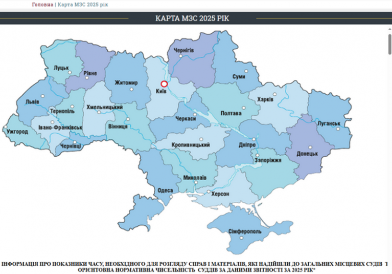 На сайті Ради суддів України оновлено інтерактивну карту судів України з розрахунками нормативів навантаження на суди та суддів з урахуванням кількості справ, які розглядаються судами впродовж 2025 року.